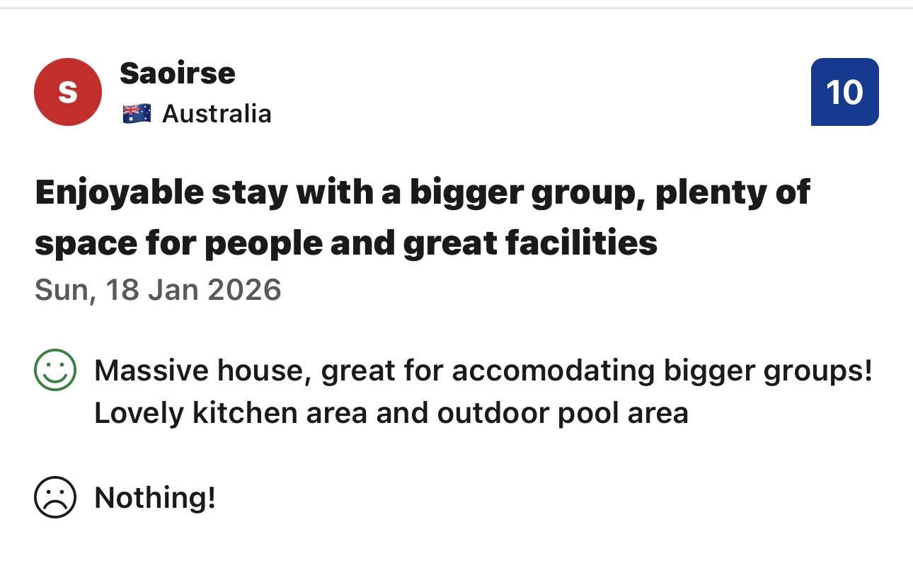 With 8 bedrooms 5 bathrooms three living areas and two equip kitchens everyone will have there own space to relax and enjoy their stay , relax outside in the heated pool and a bbq in the alfresco area play games with the large jenga games available 5 mins to the supermarkets and local shops for all your needs for your stay